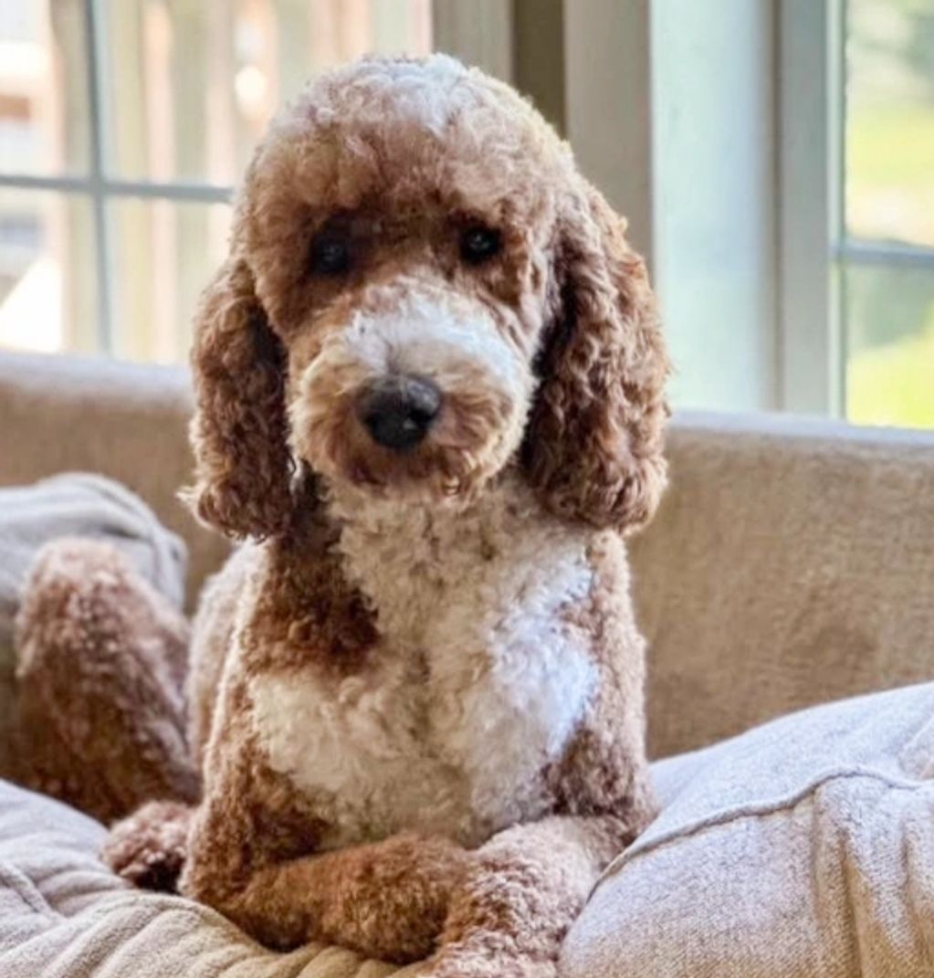 Dessie is a beautiful f1b red and white parti goldendoodle. She weighs 42lbs and is standard size. Dessie loves lake days and playing ball. She is a wonderful momma.